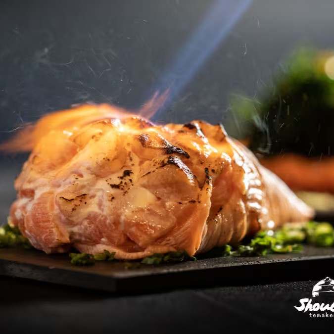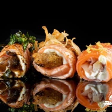 8 peças de Salmão no maçarico com azeite trufado, recheado com camarão empanado e cream cheese e coberto com molho tonkatsu e crispy de harumaki crocante.