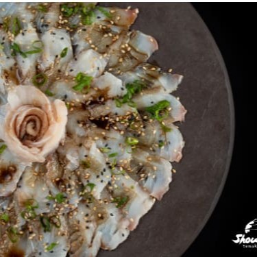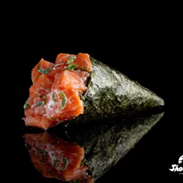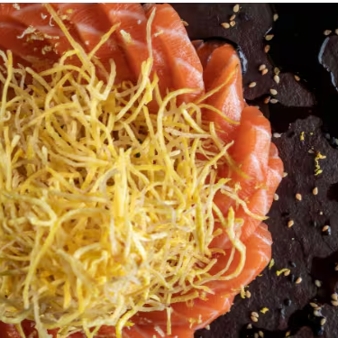 Fatias de barriga de salmão temperadas com molho especial a base de limão siciliano e shoyu com crispy de batata doce. Acompanha cebolinha e gergelim.