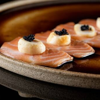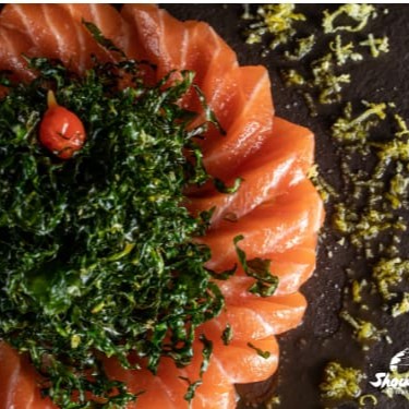 Cubos de salmão fresco levemente maçaricados, cobertos por ovas black e raspas de limão siciliano, sob molho especial trufado.