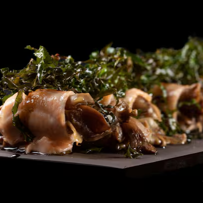 8 peças de Salmão no maçarico com azeite trufado, recheado com shimeji e cream cheese e coberto com molho tarê e crispy de couve crocante.