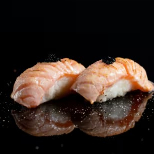 8 peças de niguiri de salmão levemente maçaricado, coberto por ovas black e finalizado com azeite trufado e flor de sal.