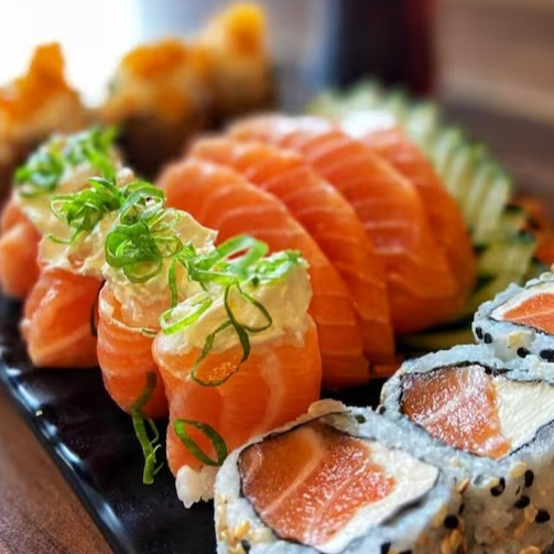 Sem arroz (substituirmos o arroz por salmão grelhado com cheese) 4 fatias sashimi salmão, 4 niguiris salmão, 4 joys salmão e 4 sushis salmão grelhado