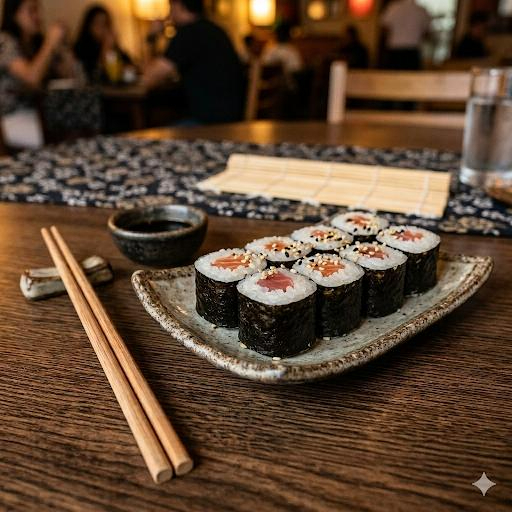 Hossomaki salmão: rolinho fino com salmão fresco, envolto em alga por fora, servido com shoyu. 8 unidades Perfeito para quem aprecia sabores delicados.