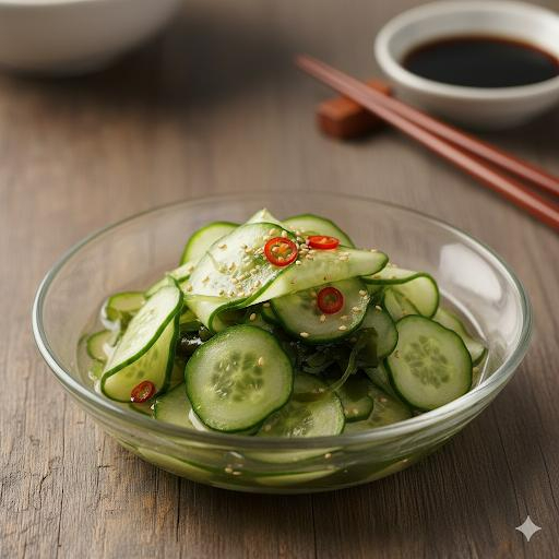 Delicadas fatias de pepino japonês temperadas e frescas, oferecendo uma entrada leve, refrescante e cheia de sabor.