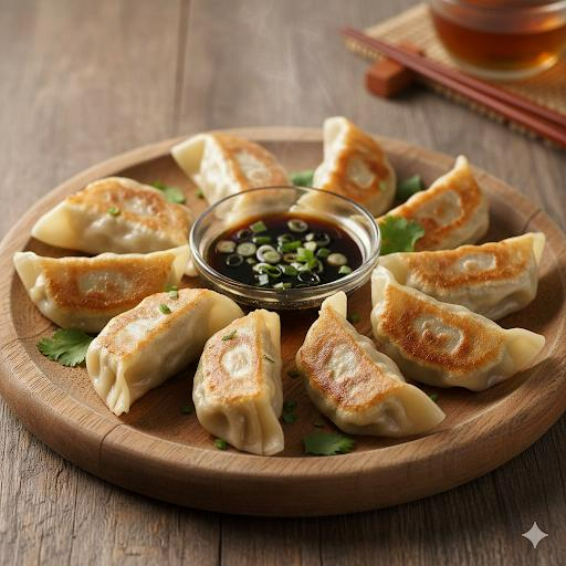 Guioza: Pastel japonês de massa fina, recheado com carne suína, servido com molho especial. Perfeito para compartilhar.