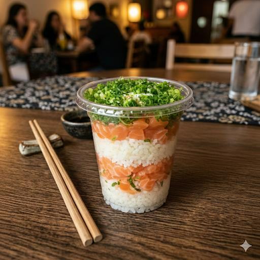 Temaki de salmão com cream cheese, cebolinha e gergilim, dentro do copo e arroz temperado.