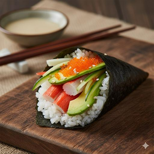 Temaki Califórnia com kani, manga, pepino e arroz, envolto em alga nori, combina frescor, doçura e sabor irresistível em cada mordida.
