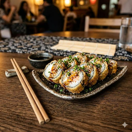 Temaki Hot com salmão grelhado, cream cheese e cebolinha, empanado e frito por fora, servido com shoyu e tarê.