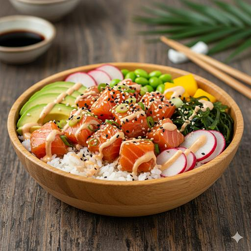 Tigela havaiana com arroz, peixe cru marinado, legumes frescos e molho especial.