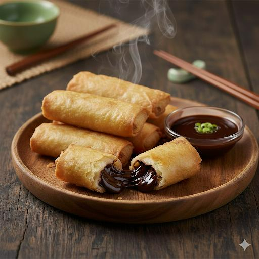 Rolinho primavera - Banana com chocolate, uma combinação deliciosa de banana macia e chocolate cremoso, envolta em uma massa crocante 5 unidades.