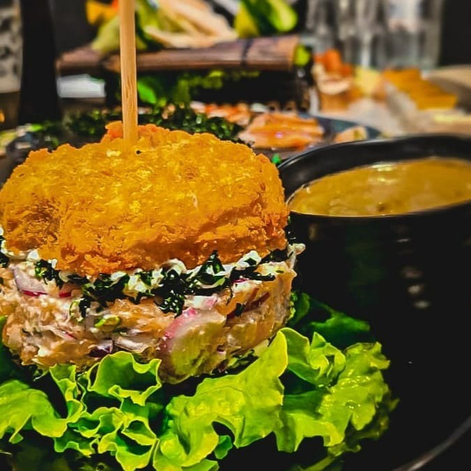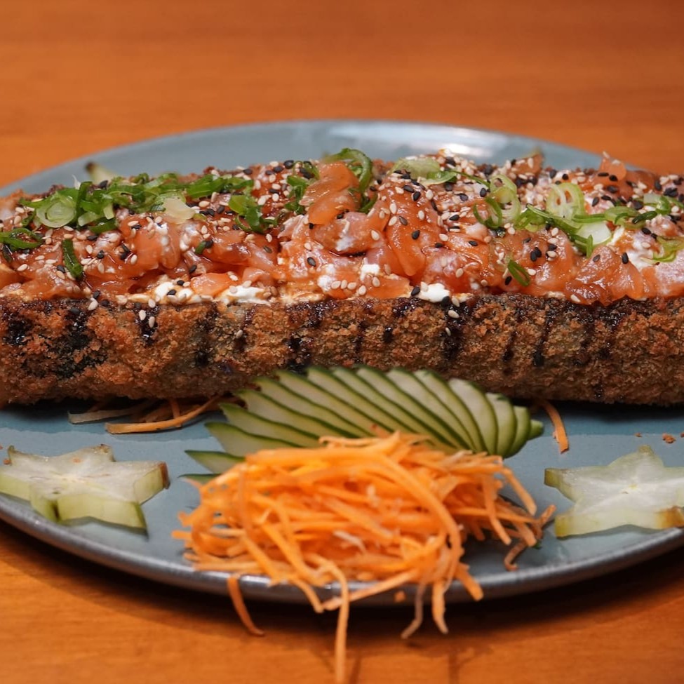 Delicioso pão de arroz japonês (mega crocante) com salmão premium, cream cheese, cebolinha e com molho tarê especial da casa.