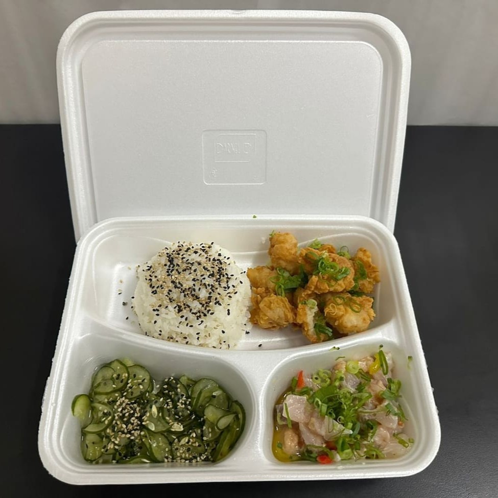 Iscas de peixe empanadas na farinha panko, Arroz japonês, Sunomono e Ceviche. Serve 1 pessoa. Obs: não alteramos itens.