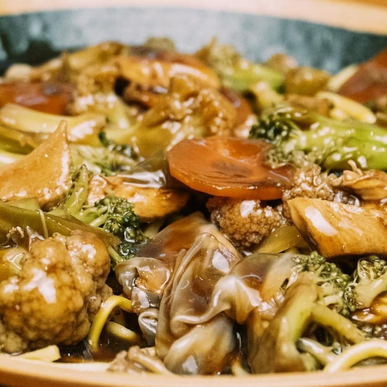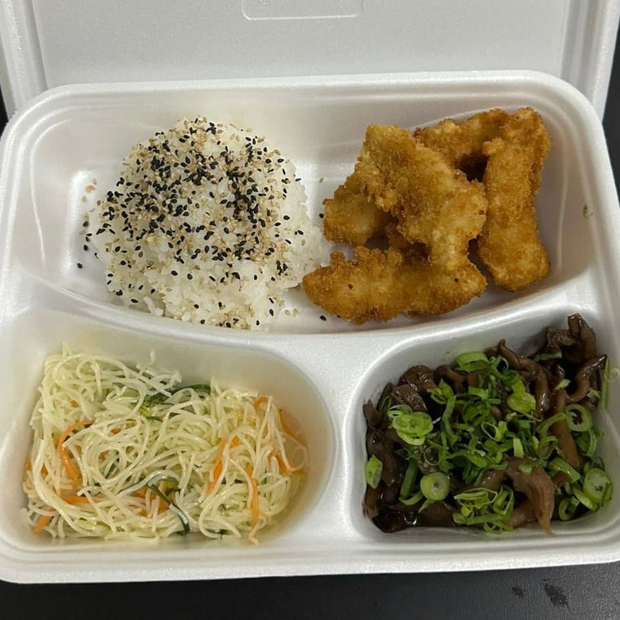 Frango empanado na farinha panko, Arroz japonês, Bifum e Shimeji. Serve 1 pessoa. Obs: não alteramos itens.