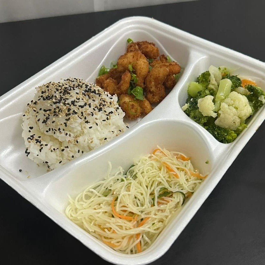 Camarão empanado na farinha panko, Arroz japonês, Bifum e Legumes na manteiga. Serve 1 pessoa. Obs: não alteramos itens.