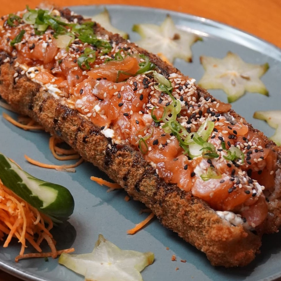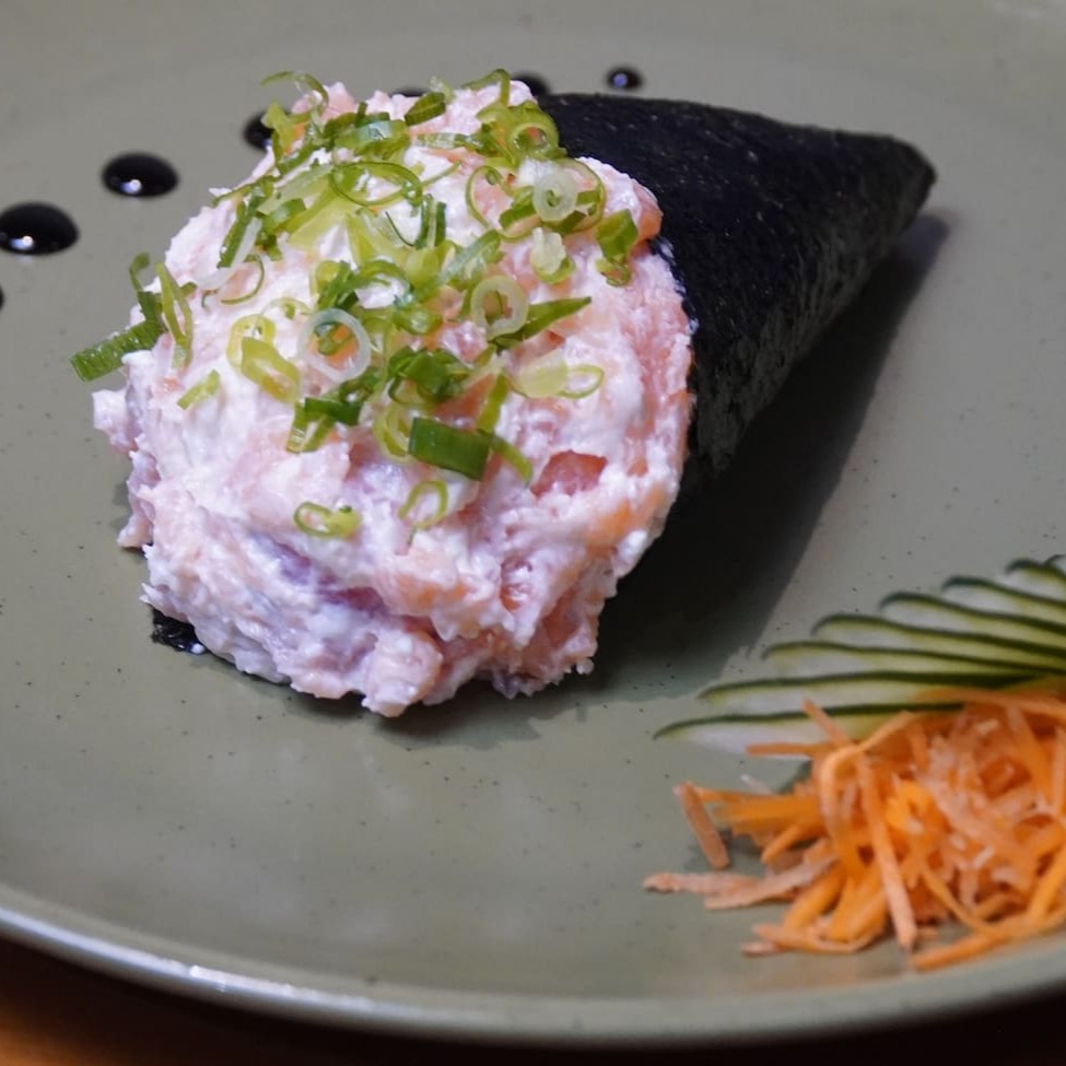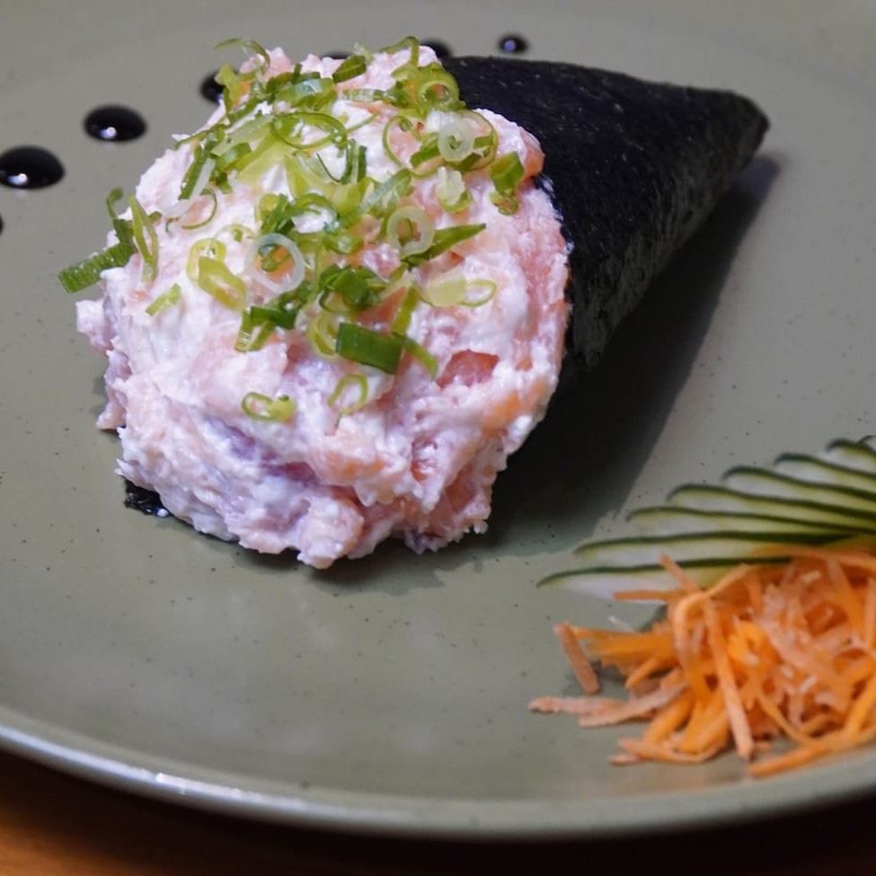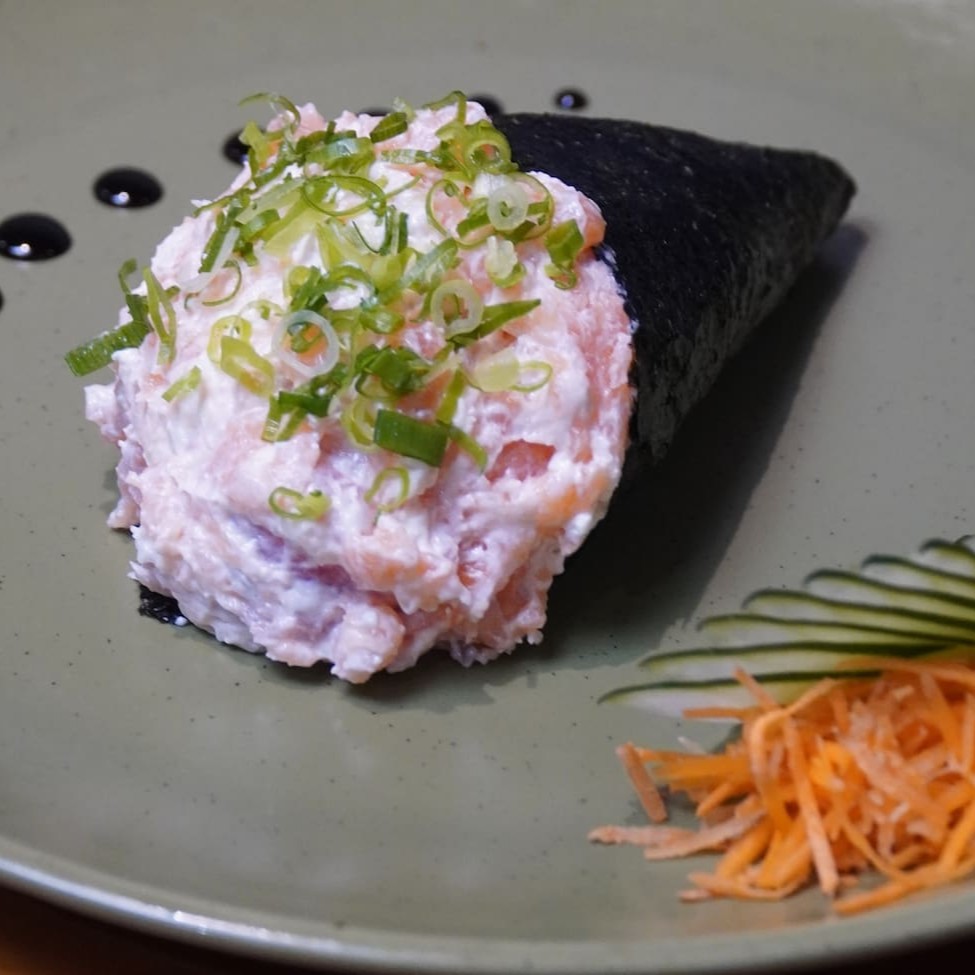 Temaki empanado e frito recheado com salmão a sua escolha, cream cheese e cebolinha.