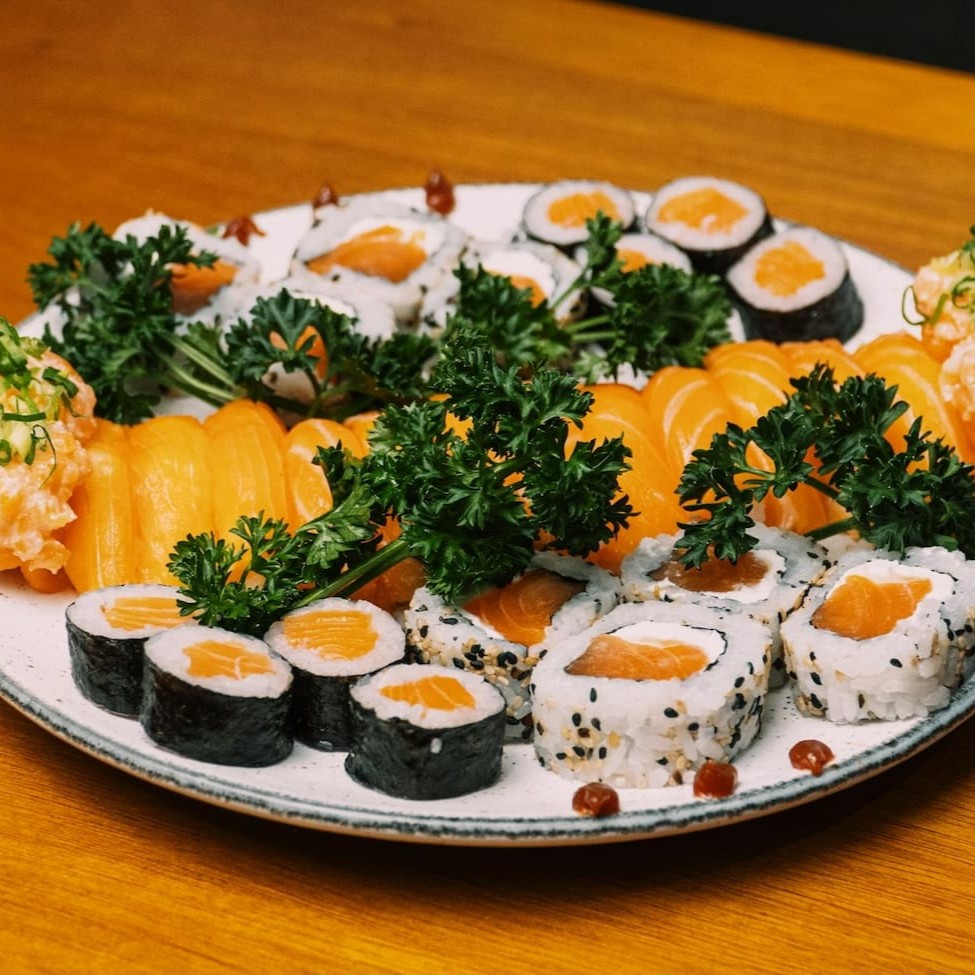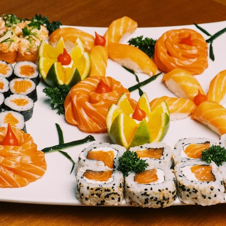 24 fatias de sashimi de salmão, 8 niguiri salmão, 8 hossomaki salmão, 8 uramakis salmão com cream cheese e 4 luizinhos de salmão com cream cheese e cebolinha.