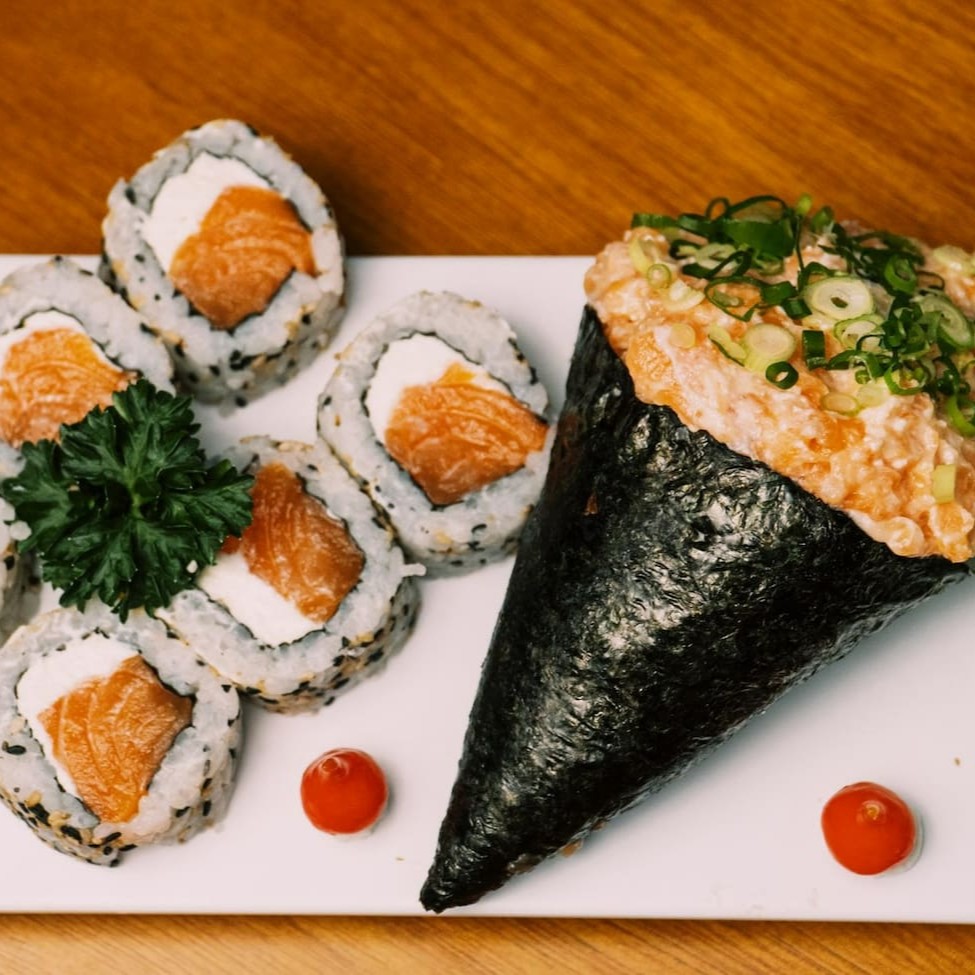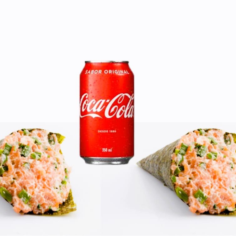 Delicioso pão de arroz japonês (mega crocante) com salmão premium, cream cheese, cebolinha e com molho tarê especial da casa. Mini temaki empanado tipo hot roll. Coca cola 350ml.