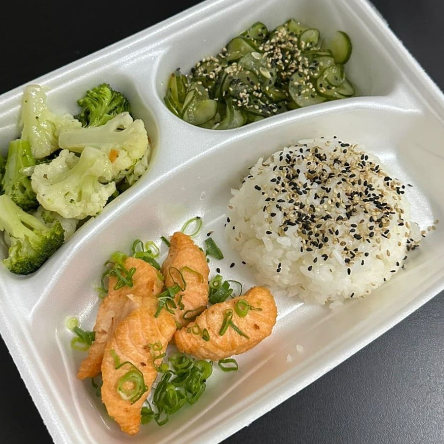 Salmão grelhado, Arroz japonês, Sunomono, Legumes na manteiga. Serve 1 pessoa. Obs: não alteramos itens.