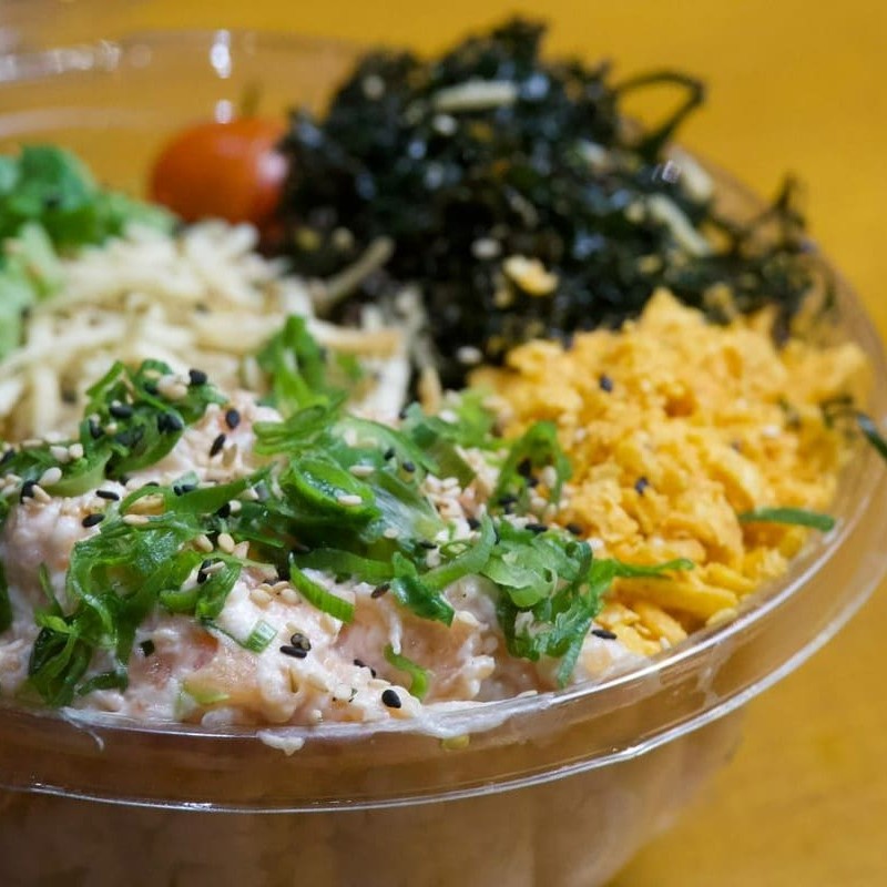 Delicioso Poke com base de arroz japonês, mix de folhas, tomate cereja, batata palha e manga. Selecione o sabor. Acompanha 1 molho especial.