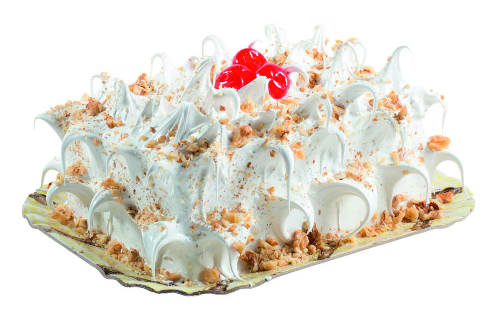 Bolo branco, recheio de creme gelado e doce de leite com nozes, cobertura de marshmallow, nozes e cerejas (decorativas).