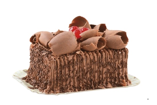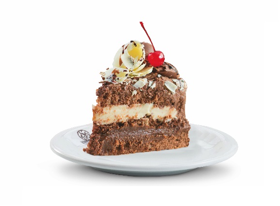 Bolo de chocolate, recheio de trufado meio amargo e creme de chocolate meio amargo aerado, cobertura de creme de chocolate meio amargo aerado, raspas de chocolate meio amargo e cerejas (decorativas).