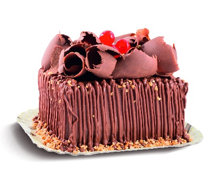 Bolo de massa de chocolate, recheios de mousse de chocolate e creme de chocolate branco aerado, cobertura de mousse de chocolate, raspas de chocolate ao leite e branco e cerejas decorativas.