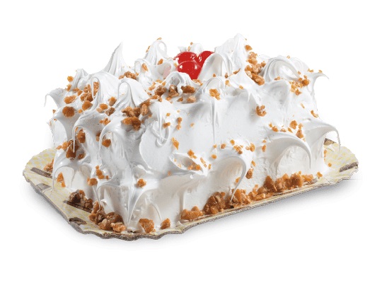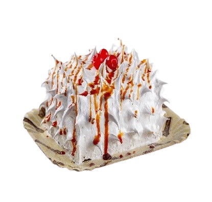 Bolo branco, recheio de doce de leite e baba de moça, cobertura de marshmallow, calda de caramelo e cerejas (decorativas).