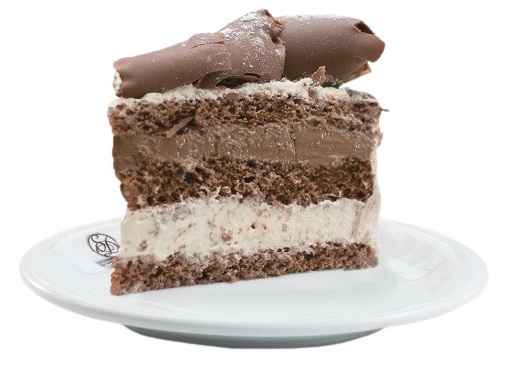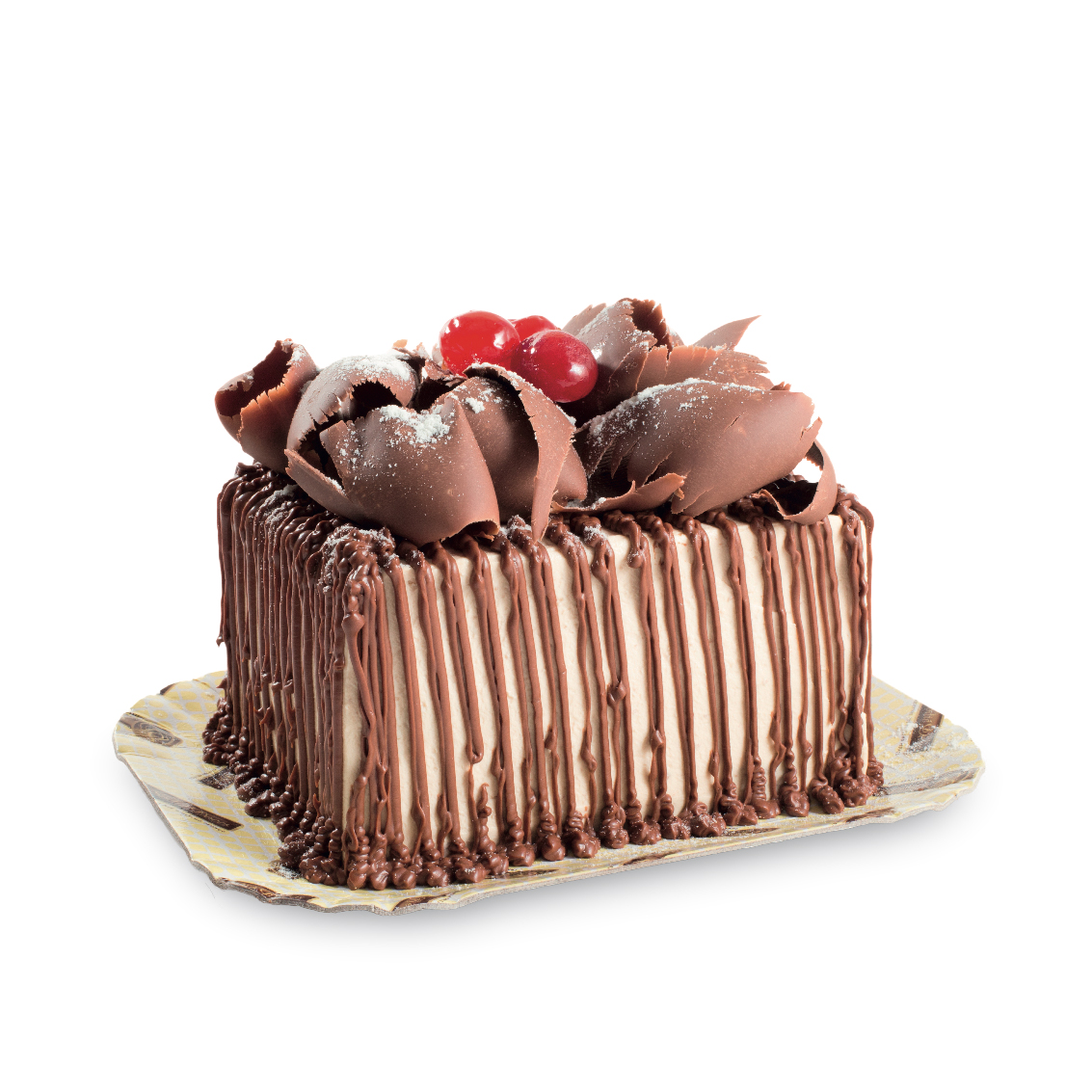 Bolo de massa de chocolate, recheios de mousse de chocolate e trufado de chocolate ao leite, cobertura de mousse de chocolate, raspas de chocolate ao leite, calda de chocolate e cerejas decorativas.