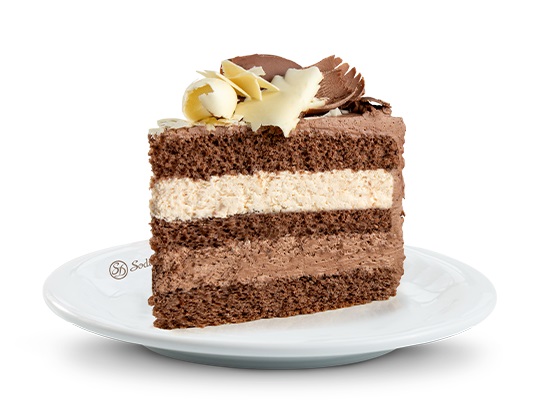 Bolo de massa de chocolate, recheios de mousse de chocolate e creme de chocolate branco aerado, cobertura de mousse de chocolate, raspas de chocolate ao leite e branco e cerejas decorativas.