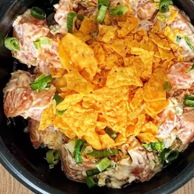 Salmão cru em cubos, cebolinha, cebola roxa, pepino em fatias, cream chease, gergilim e tare.