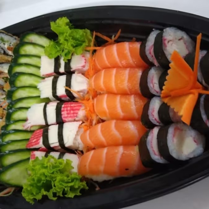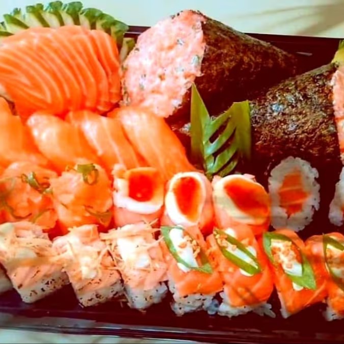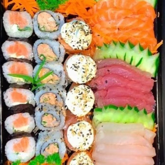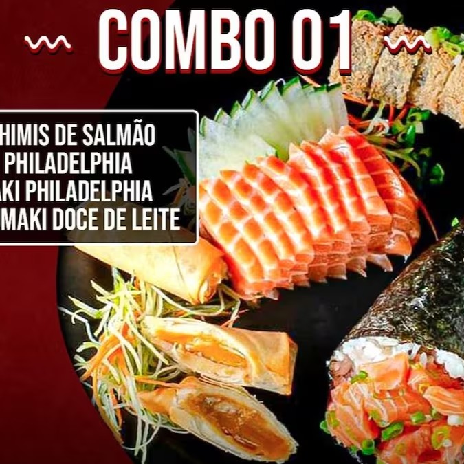 6 sashimis de salmão + 6 sashimi de atum + 6 Sashimi peixe branco + 12 hot crocante + 06 philadelfia roll + 06 huramaki salmão + 05 joe joe + 2 harumakis de chocolate + 2 Cocas lata.