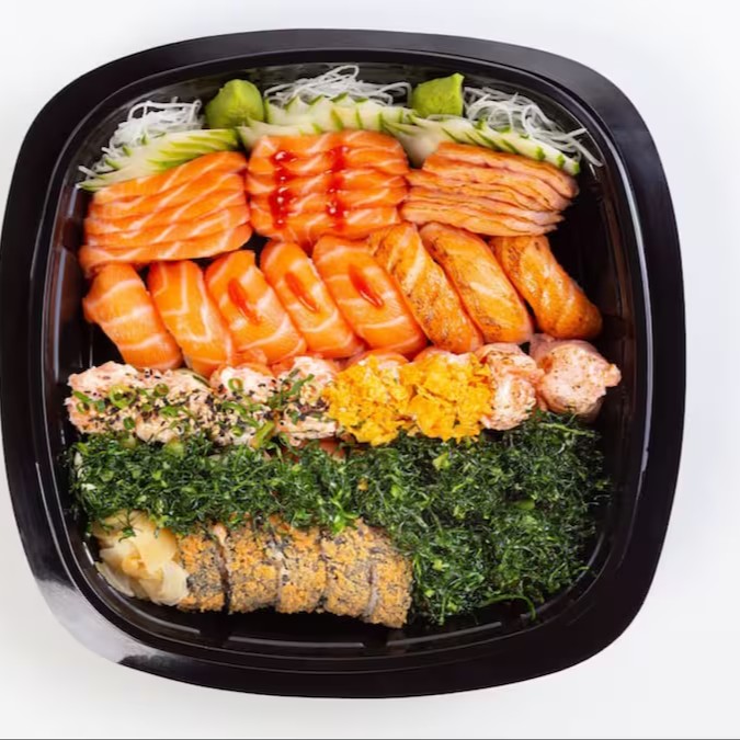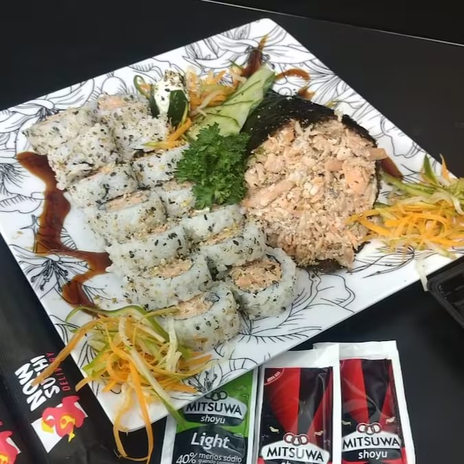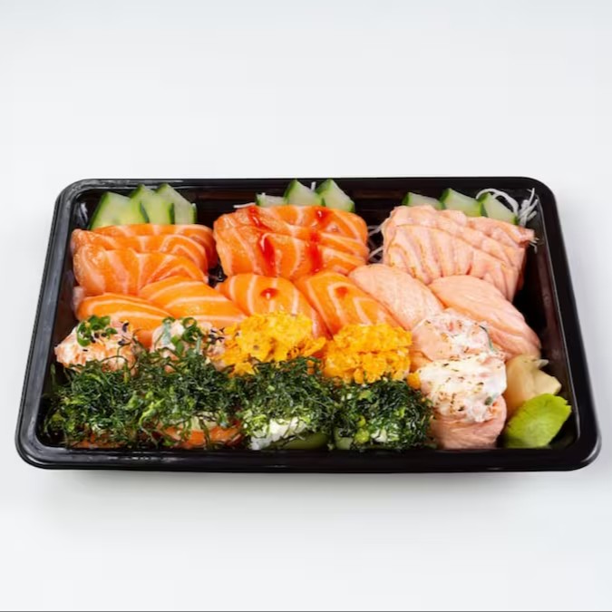 5 niguiris de salmão, 8 unid. De shakemaki, 10 fatias de sashimi de salmão, 2 unid jow de salmão