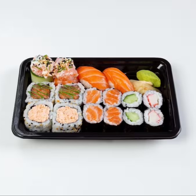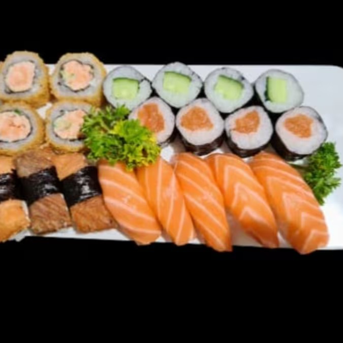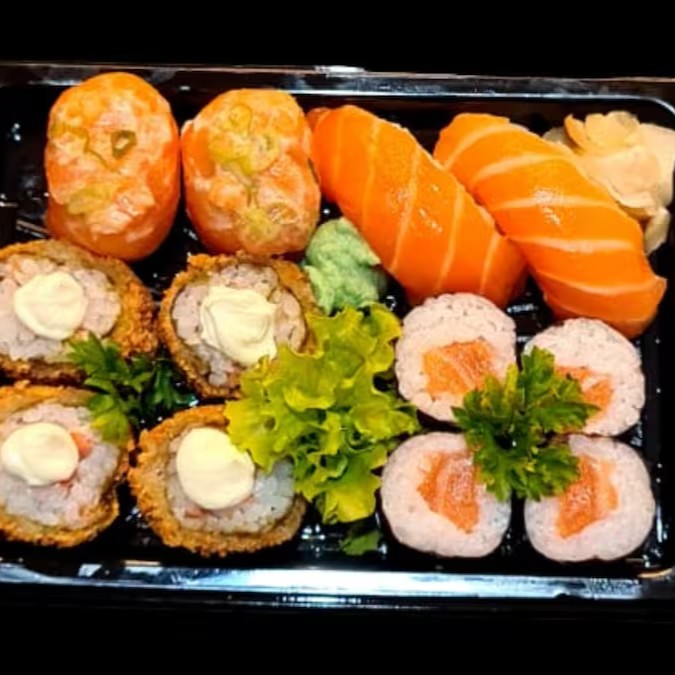 5 sashimi de salmao, 5 niguiri de salmao, 4 uramaki e 8 hossomaki 4 hot roll