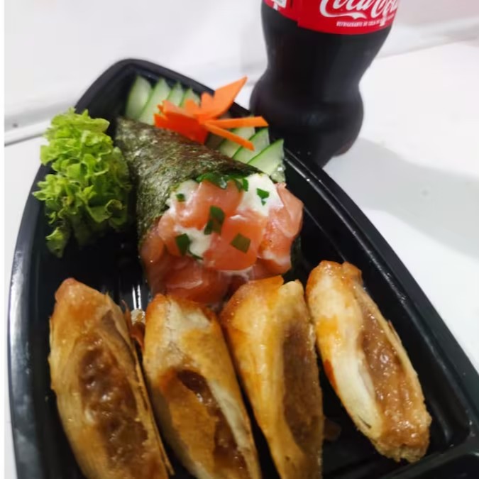 1 temaki Philadelphia, 1 harumaki doce de leite e 1 coca pet.