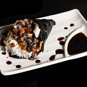Pele do salmão grelhada, arroz Japonês, alga e Cream Cheese, feito Especialmente Pra Você!