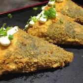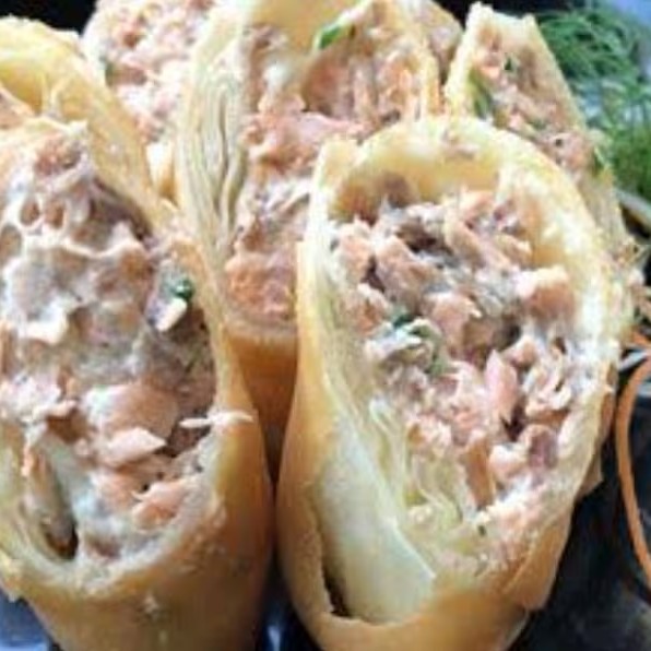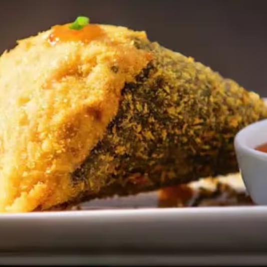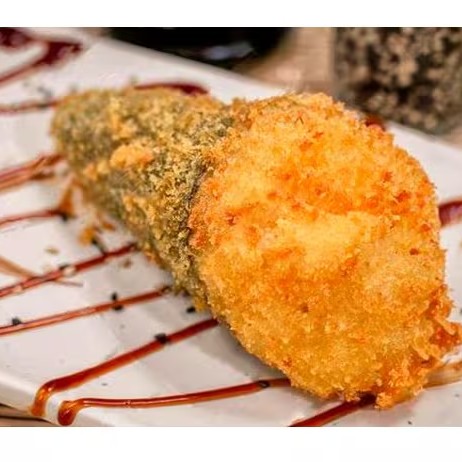 Enrolado empanado e frito. Feito com alga, arroz, Salmão, cream cheese, cebolinha, couve crocante e molho tarê (10 unidades)