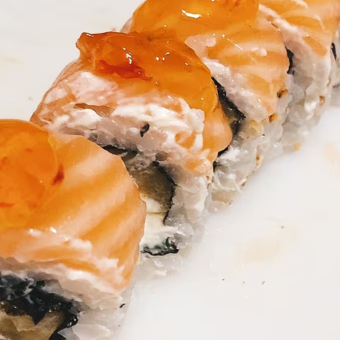 Uramaki envolto em uma lâmina de salmão com cream cheese e geleia de pimenta.