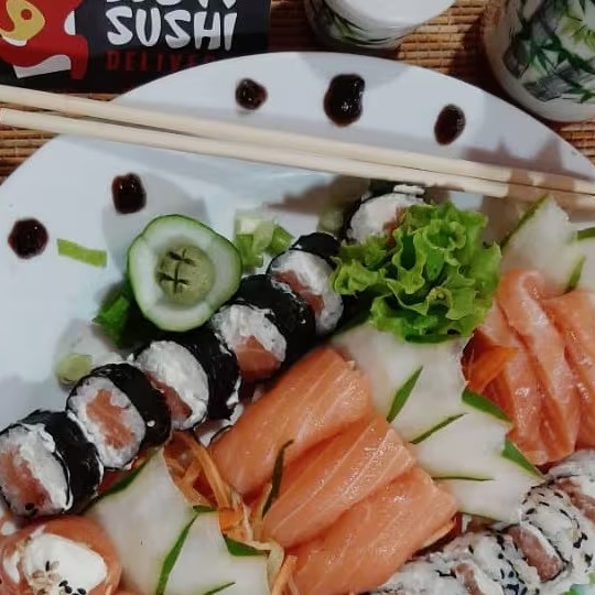 16 sashimis de salmão + 12 hot crocante + 06 philadelfia roll + 06 skin roll + 05 joe joe + Teryaki