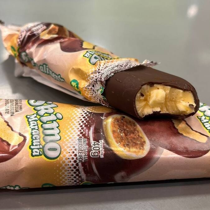 Picolé sabor maracujá, coberto com uma deliciosa casquinha de chocolate crocante