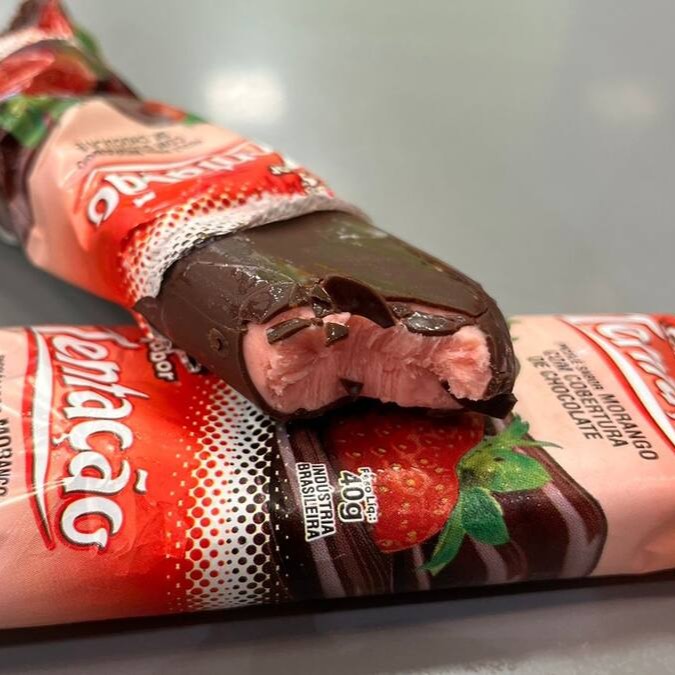 Picolé sabor morango, coberto com uma deliciosa casquinha de chocolate crocante