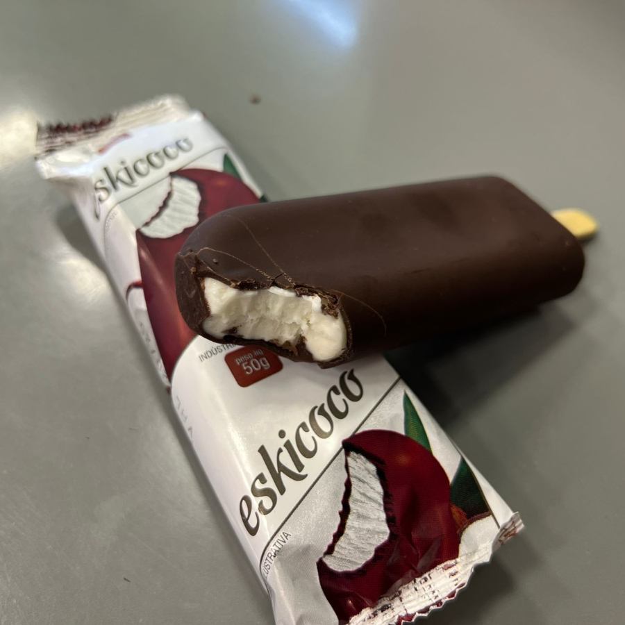 Picolé sabor coco branco coberto com uma casquinha crocante de chocolate