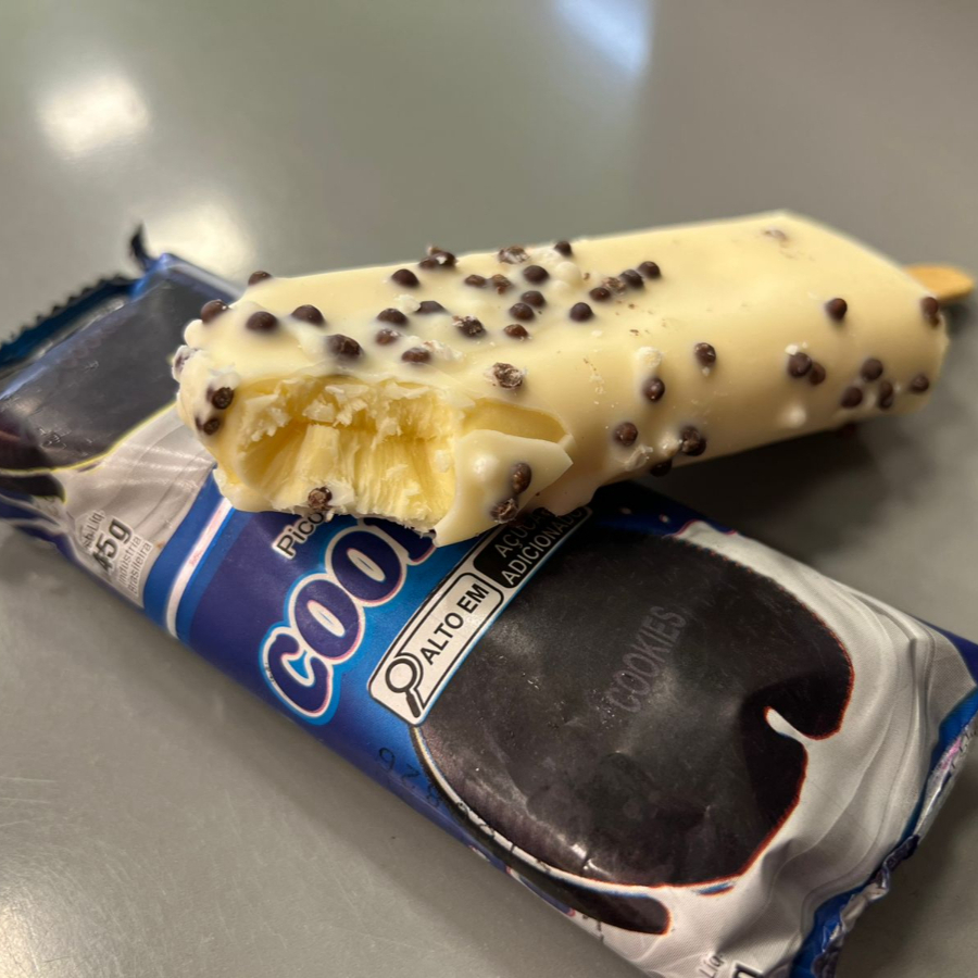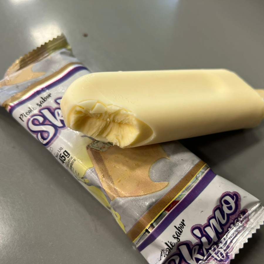 Picolé sabor chocolate branco coberto com uma deliciosa casquinha crocante de chocolate branco