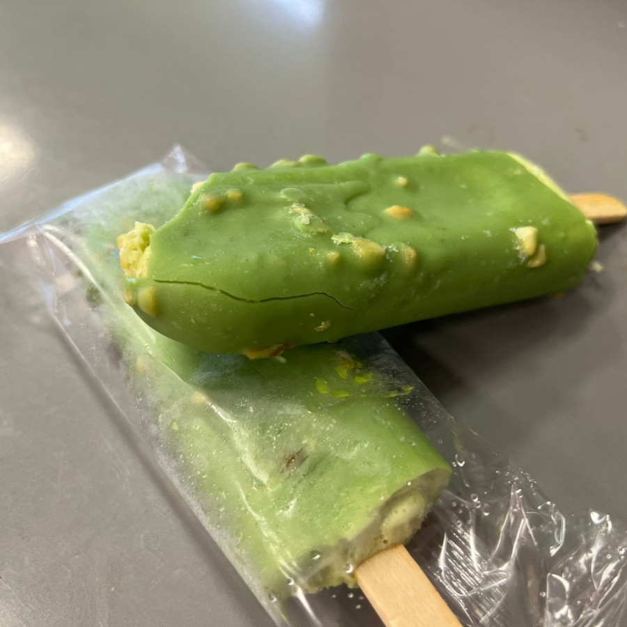 Picolé sabor pistache coberto com uma casquinha crocante de pistache com pedacinhos de castanha