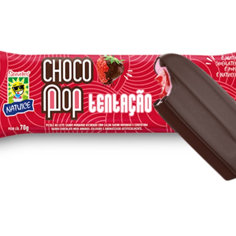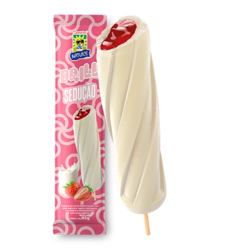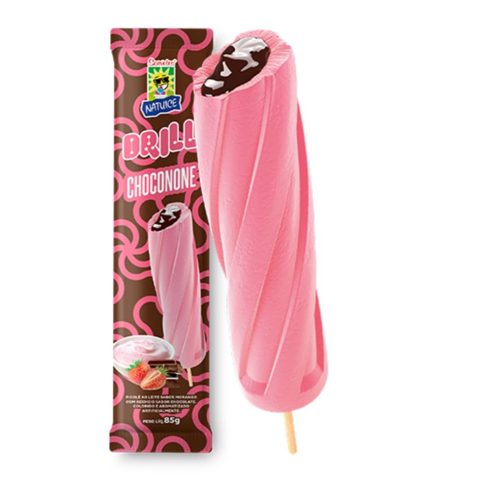 Picolé de morango com recheio cremoso de morango e coberto com uma deliciosa casquinha de chocolate.