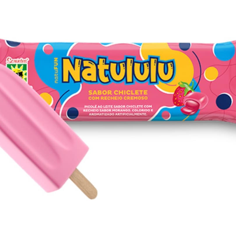 Picolé cremoso sabor chiclete Babalu com recheio de morango.