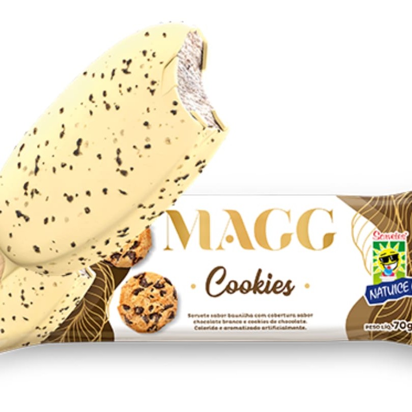 Sorvete no palito de baunilha com cookies, finalizado com casquinha de chocolate branco.