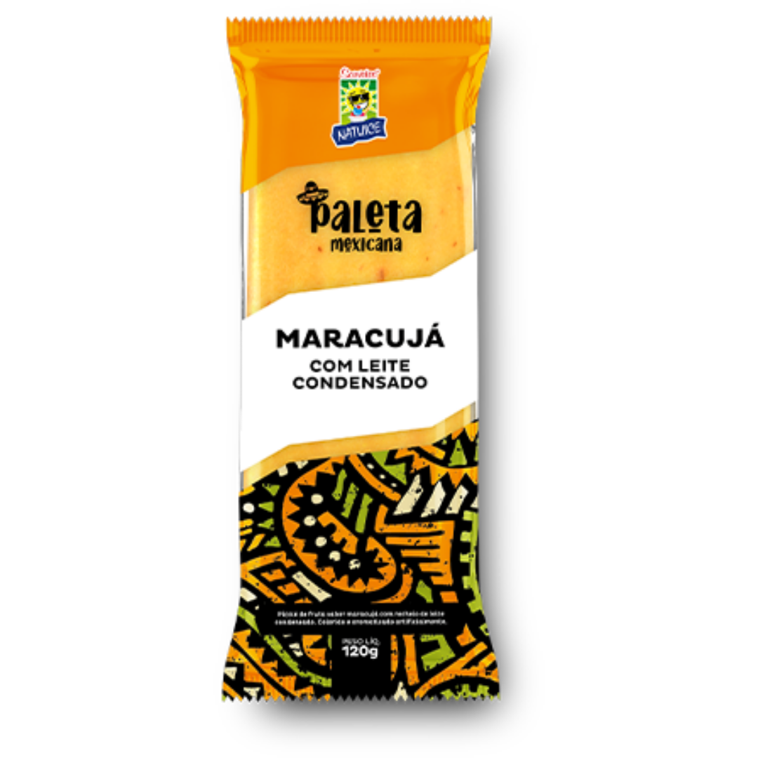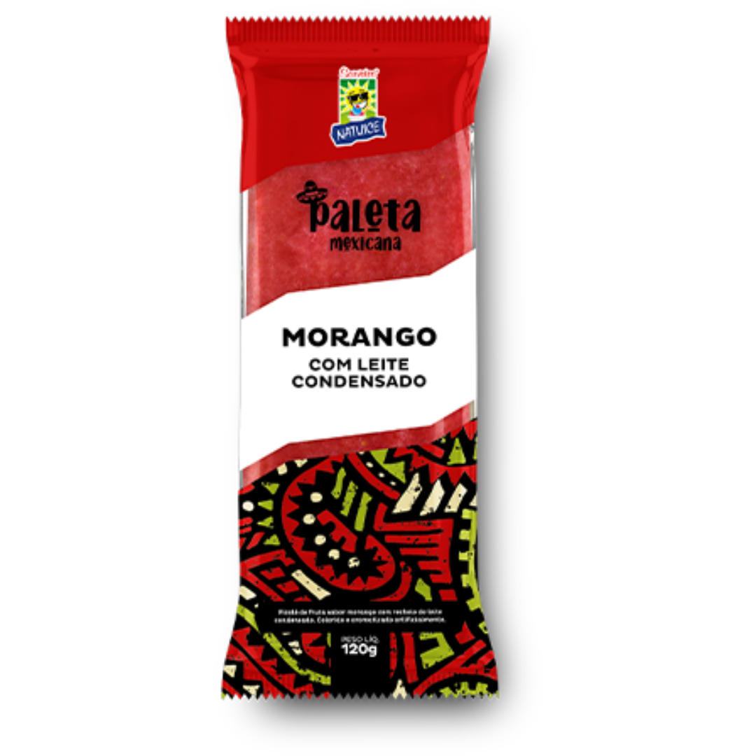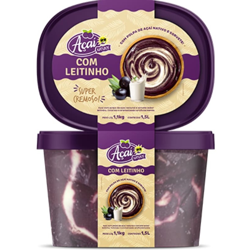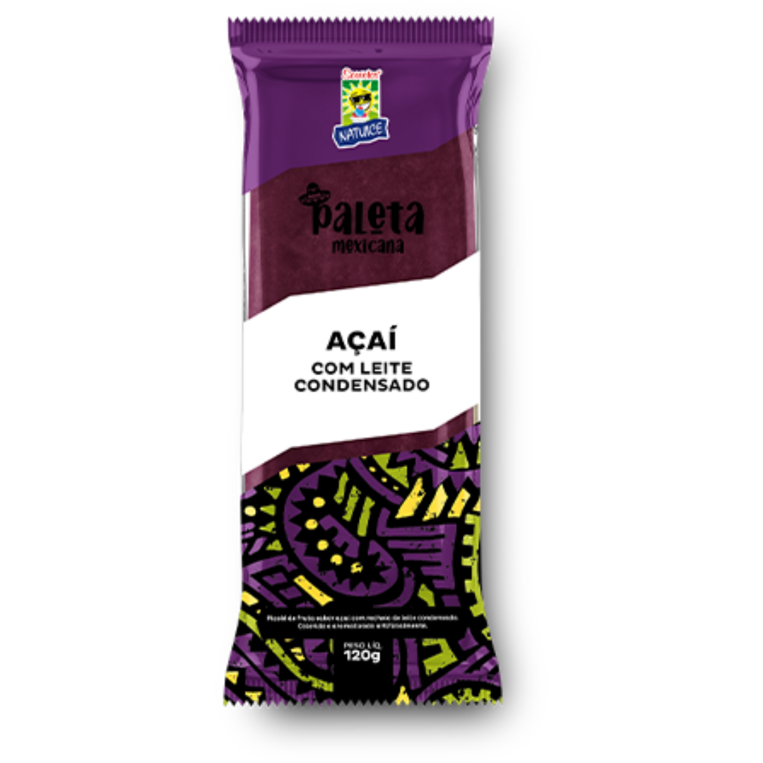 Picolé de fruta sabor açaí com recheio de leite condensado.