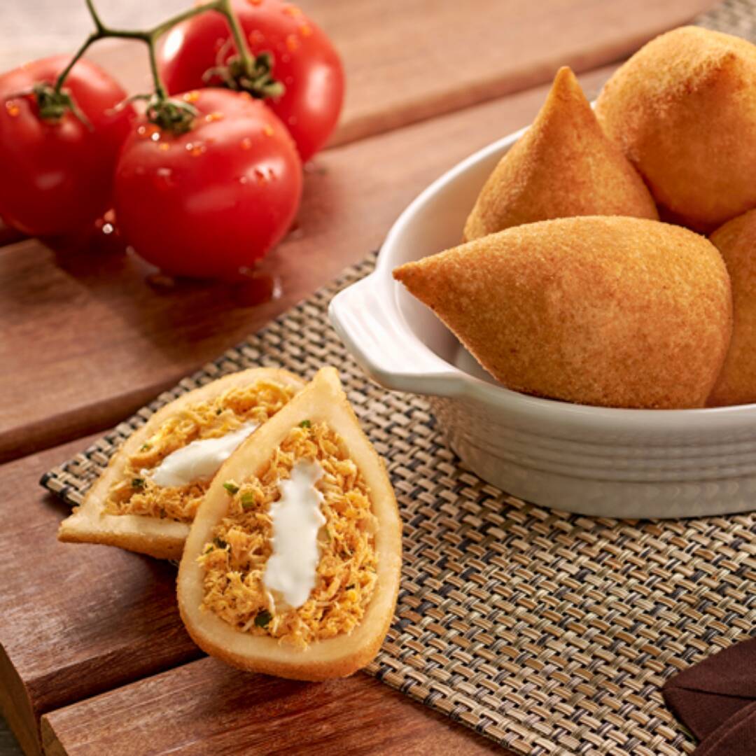 Coxinhas de frango recheadas de requeijão congeladas. São coxinhas muito bem servidas e saborosas para facilitar a correria do dia-a-dia!