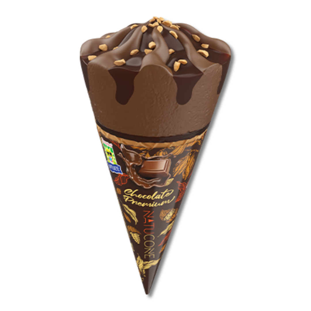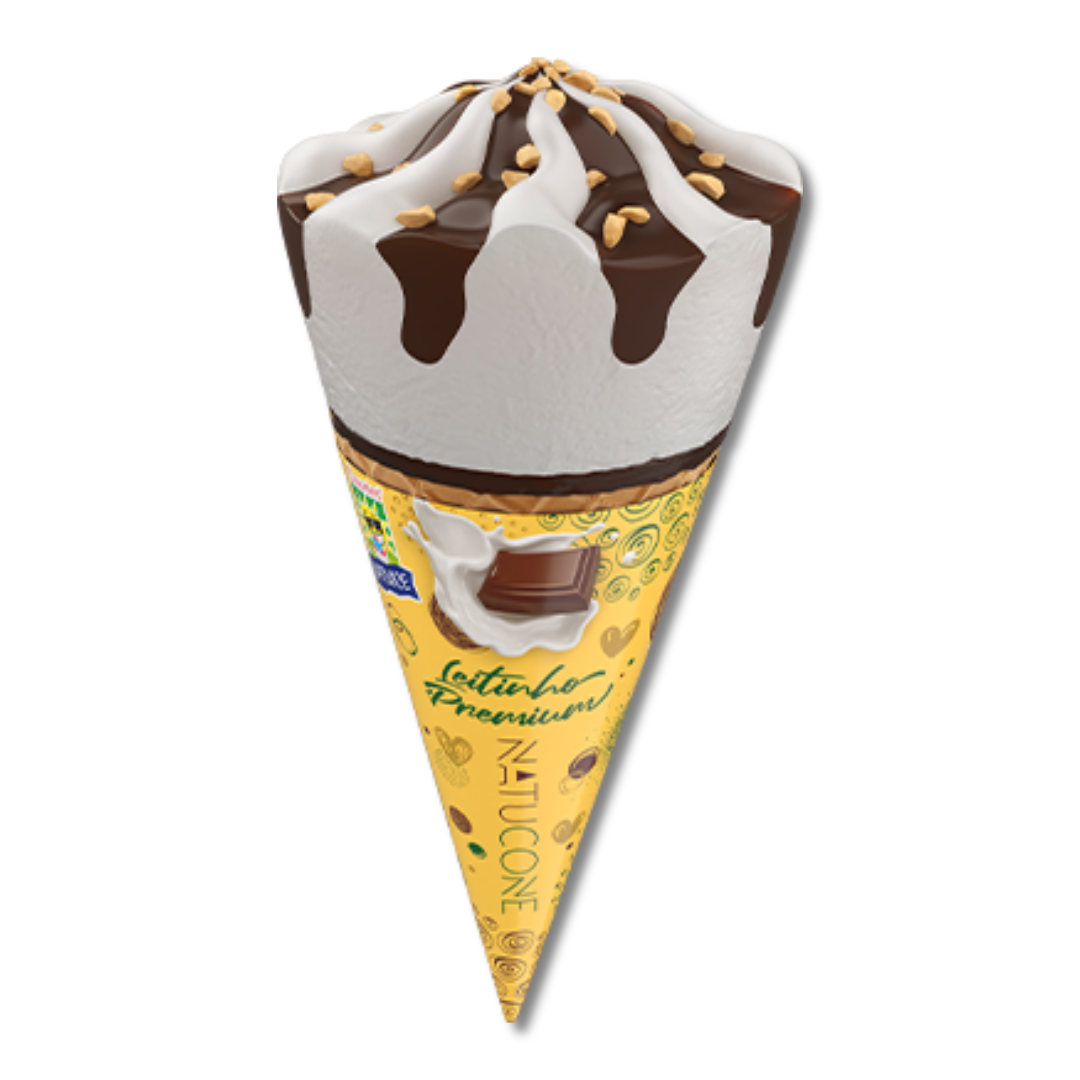 Clássico cone com sorvete de ninho, cobertura de chocolate e coberto com amendoim, uma delícia!