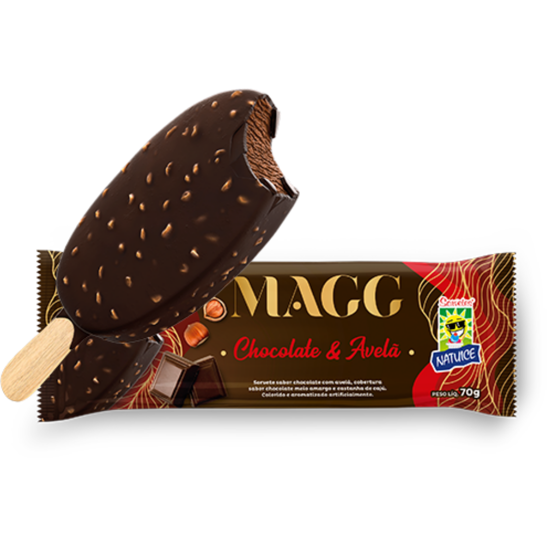 Sorvete no palito de chocolate e avelã com casquinha de chocolate.